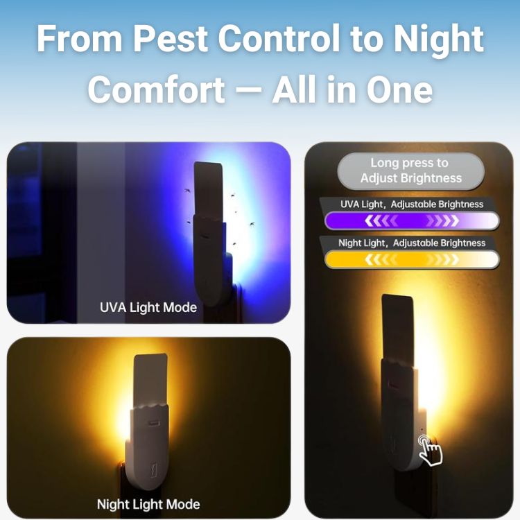 The PureLight Trap™ uses dual UVA light (365nm & 395nm) to attract flying insects like gnats, mosquitoes, and fruit flies. Once they approach, they get gently trapped on the sticky board — without noise, zapping, or chemicals.